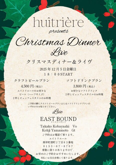 「Christmas Dinner Live 〜クリスマスディナー&ライヴ〜」を開催します。