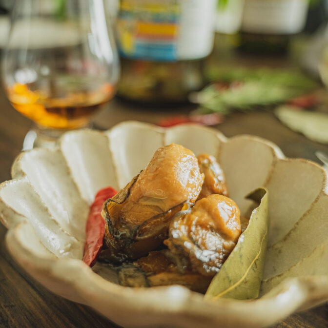 そんな美味しい牡蠣を燻製にしました。燻製に使用するチップは厚岸町産のエゾヤマザクラを使い、じっくりと燻製して隅々まで薫香がいきわたった牡蠣をオリーブオイルに漬け込むことでこってりとした味わいになっています。